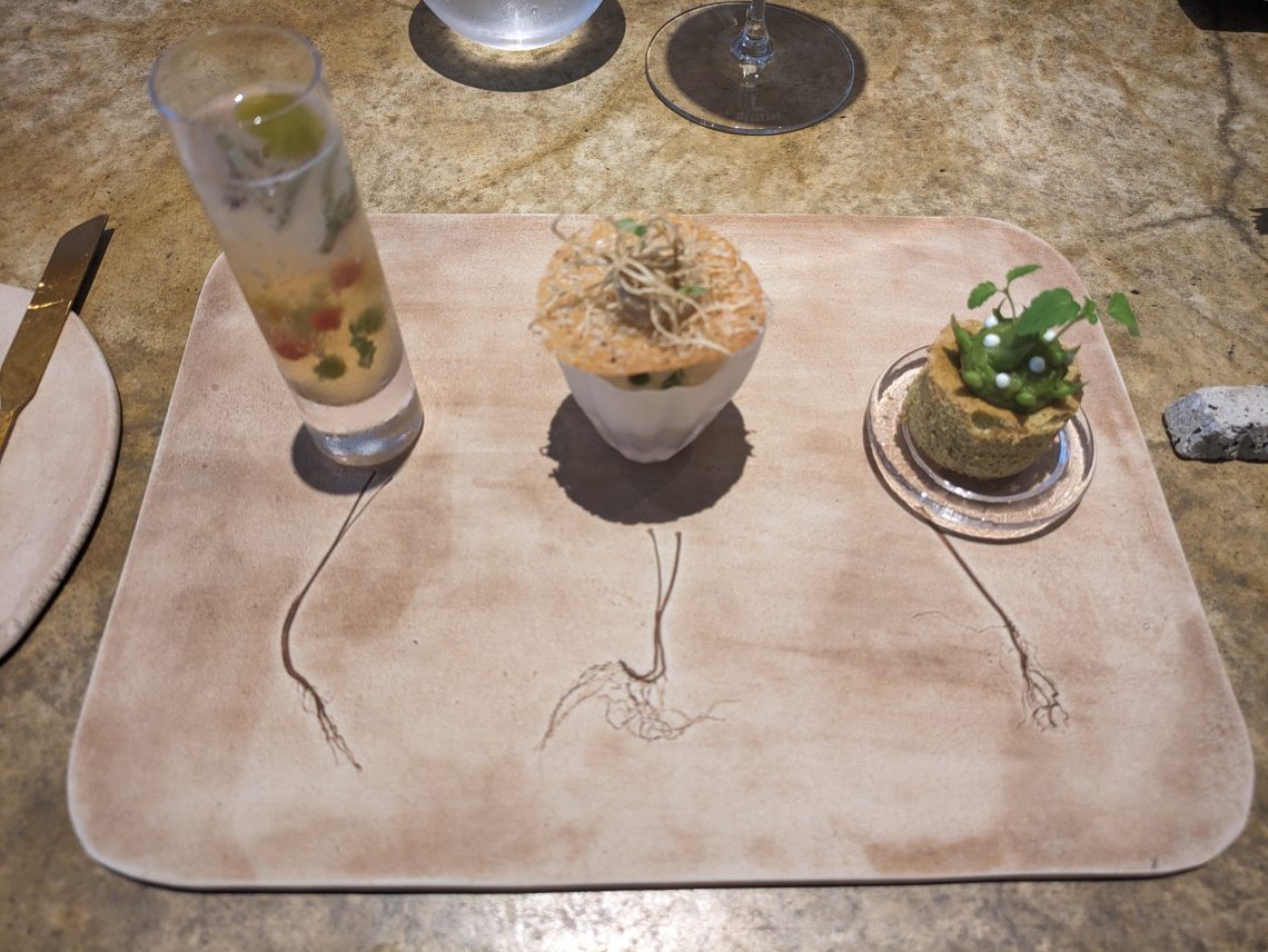 왼쪽부터 순서대로, 토마토 워터, 신 우엉 무스, 산초 쉬폰 케이크와 아스파라거스 크림입니다.