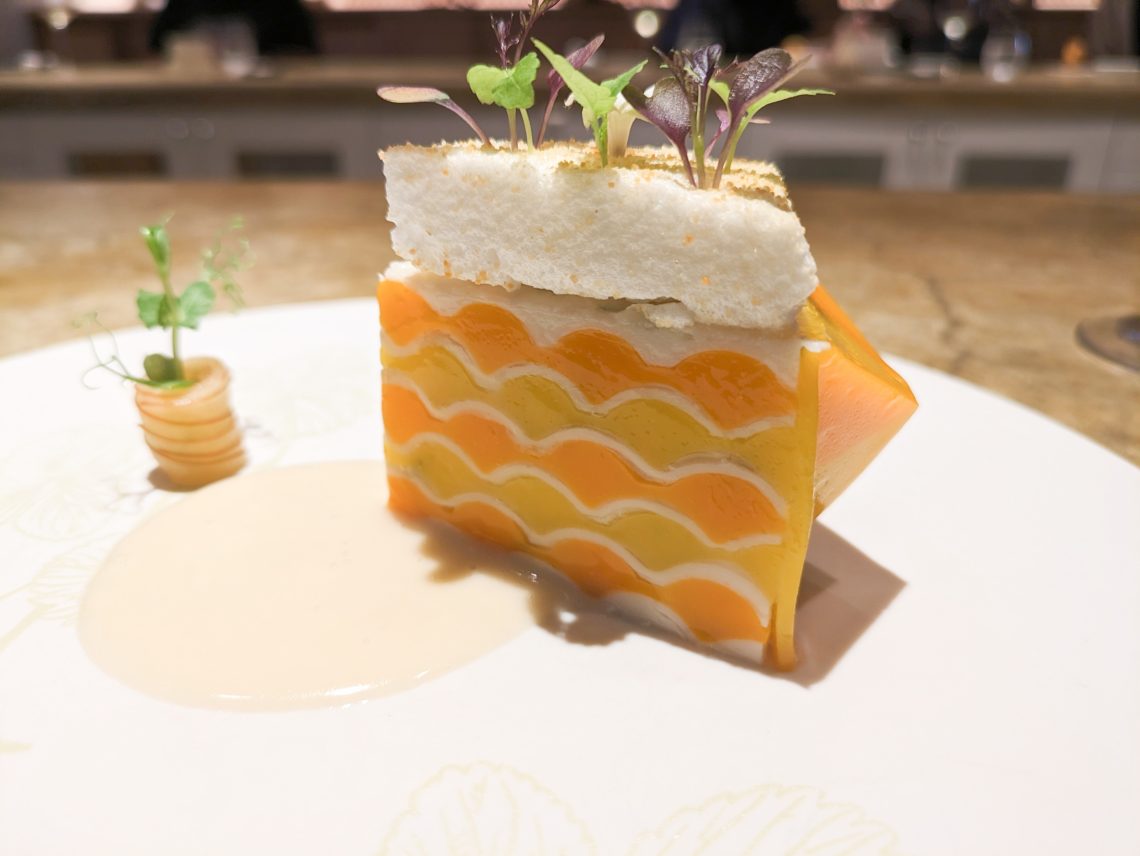 언뜻 보면 ‘오리가미’는 평범한 당근 요리처럼 보일지도 모릅니다. 그러나 나이프를 대는 순간, 마치 부드러운 케이크를 자르는 듯한 감각을 느낄 수 있습니다. 입에 넣는 순간 진한 가리비의 감칠맛이 입안 가득 퍼지고, 유자의 상큼한 향이 그 위에 더해지며 조화를 이룹니다. 마치 맛으로 가득한 꿈속에 있는 듯한, 한 입 한 입이 새로운 발견으로 가득 찬 경험을 선사합니다.