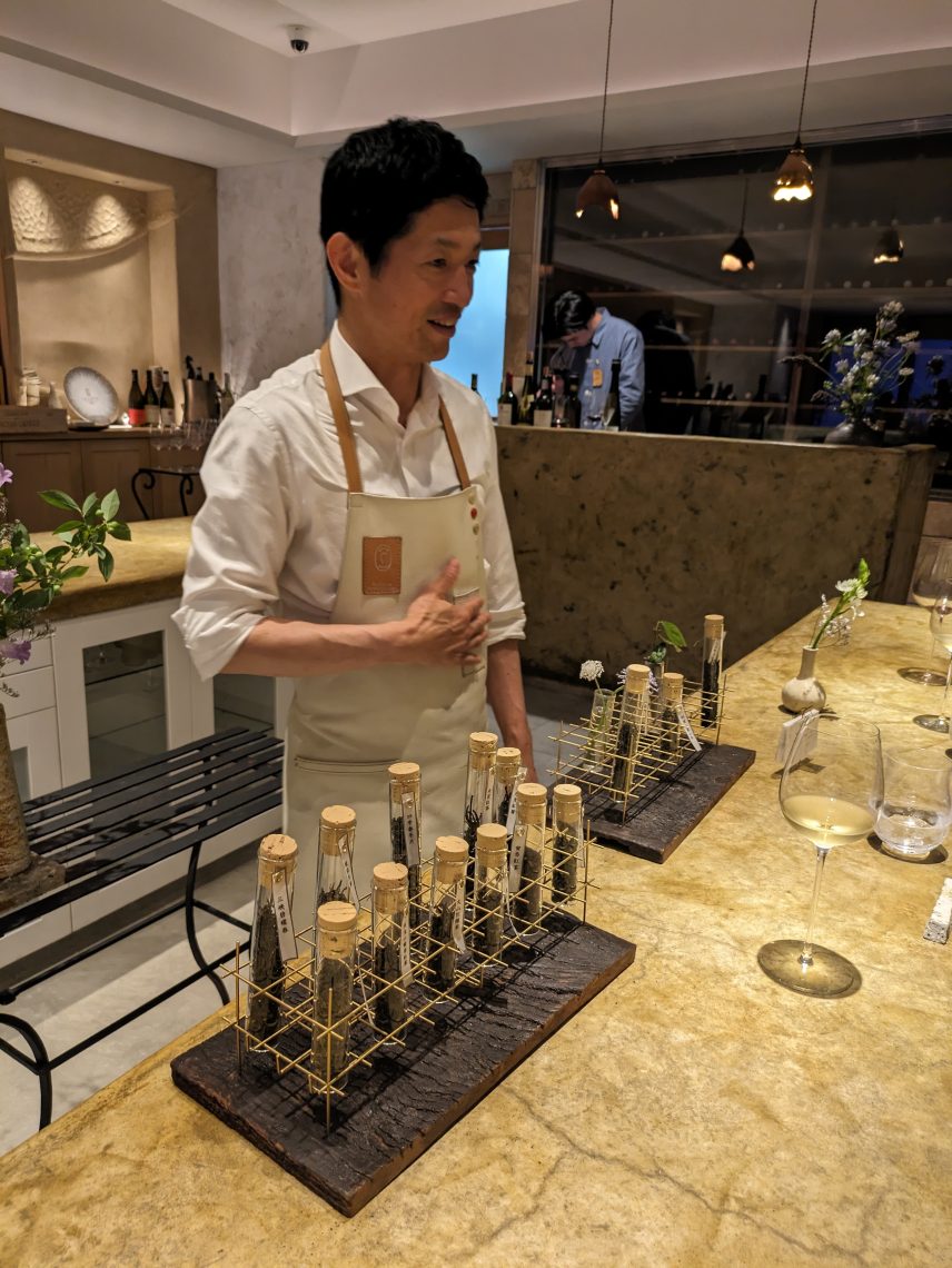 다카야마 셰프가 엄선한 대만 차가 테이블로 운반되었습니다. 테이블 위에는 다양한 종류의 찻잎이 진열되며, 저희는 마음에 드는 찻잎을 자유롭게 선택할 수 있었습니다.