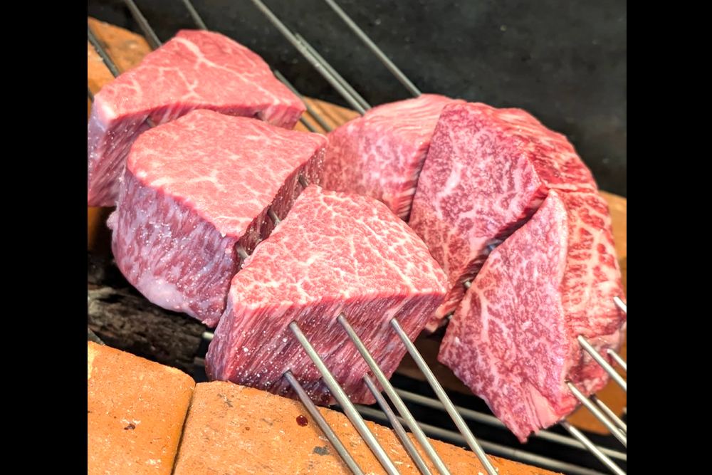 這道招牌料理特意選擇脂肪較少的神戶牛赤身沙朗或菲力,連著脂肪一起以炭火香烤,待上菜時再將脂肪部位去除。